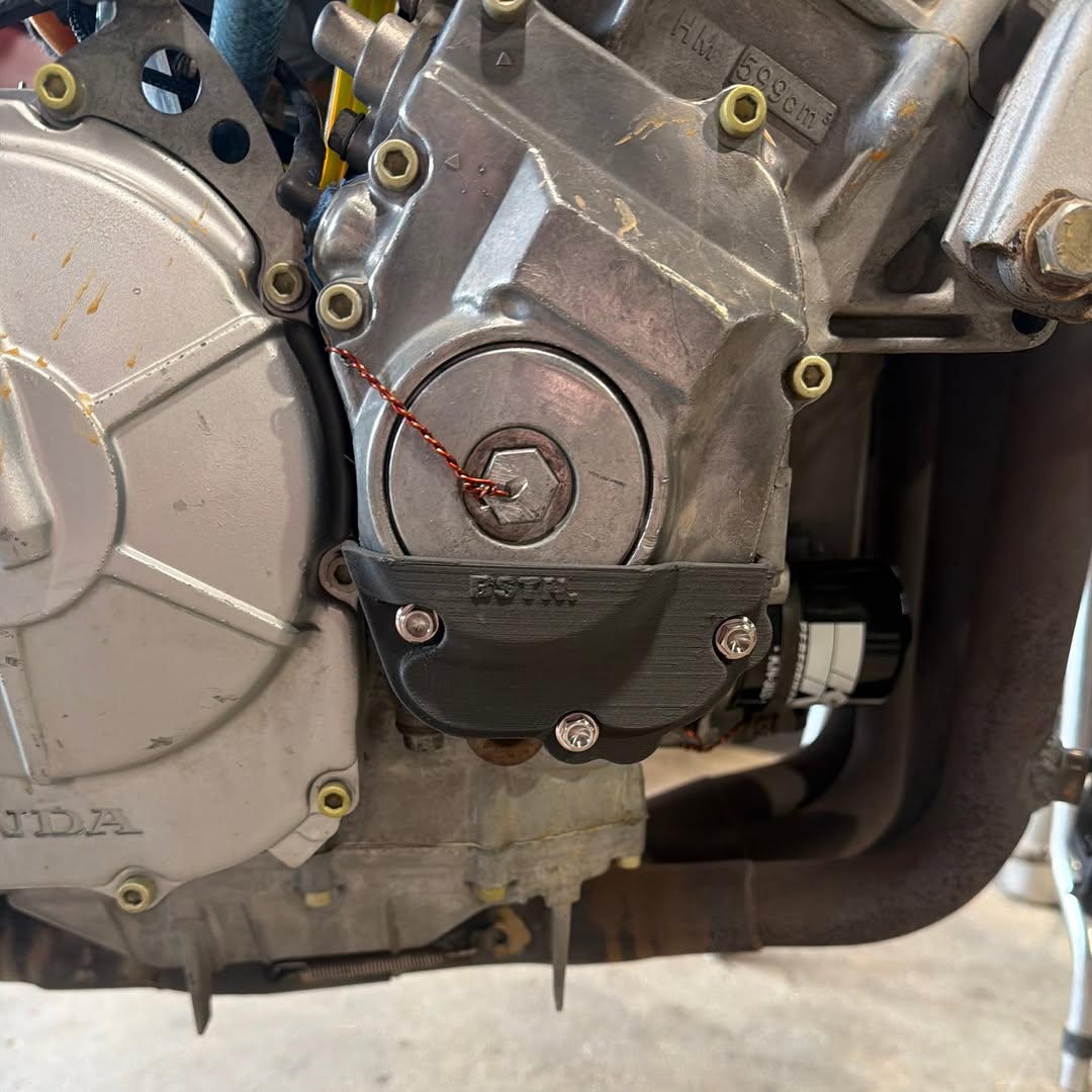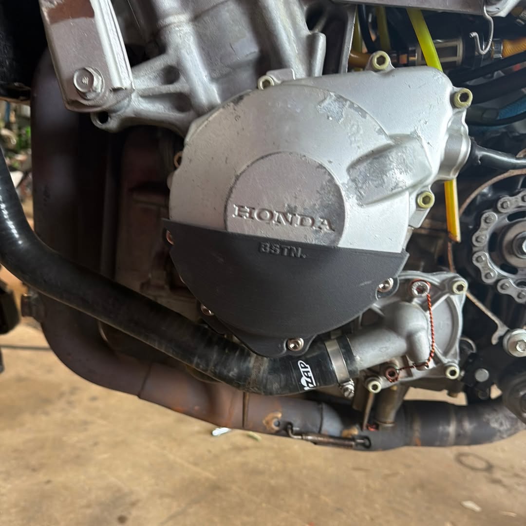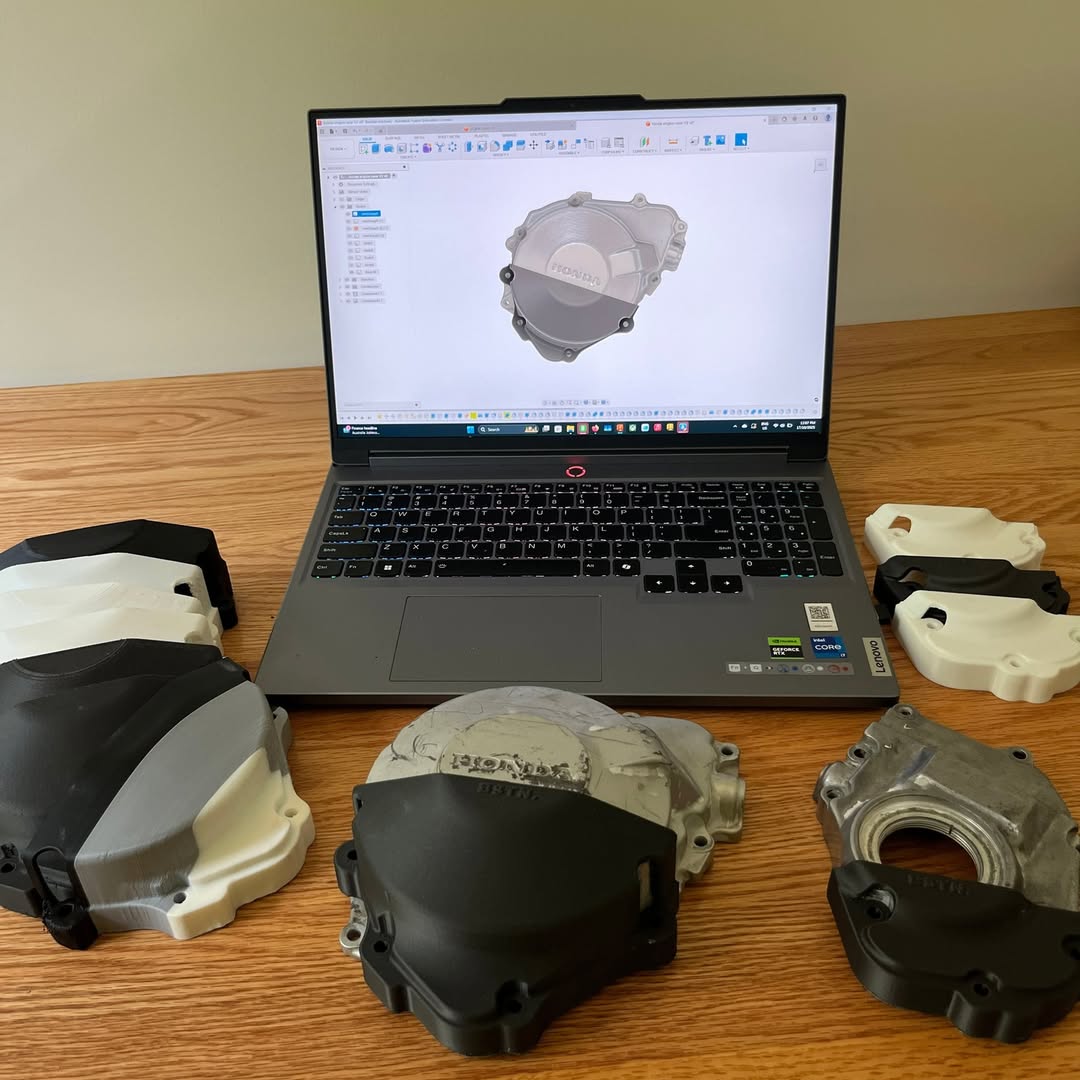 Replacement covers for older bikes like the CBR600 F2/F3 are difficult to find, so these were created as a functional alternative for a rider competing in pre-modern racing. Original engine cases were scanned to capture geometry accurately, then imported into Fusion 360 for modelling and refinement. Multiple fitment iterations and test prints were used to reach the final design. The finished parts are printed in carbon fibre–infused nylon (PA-CF) for strength, heat resistance, and low-friction abrasion performance near the engine.